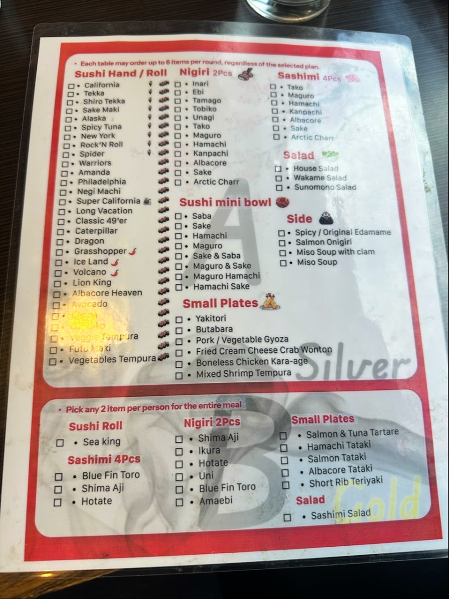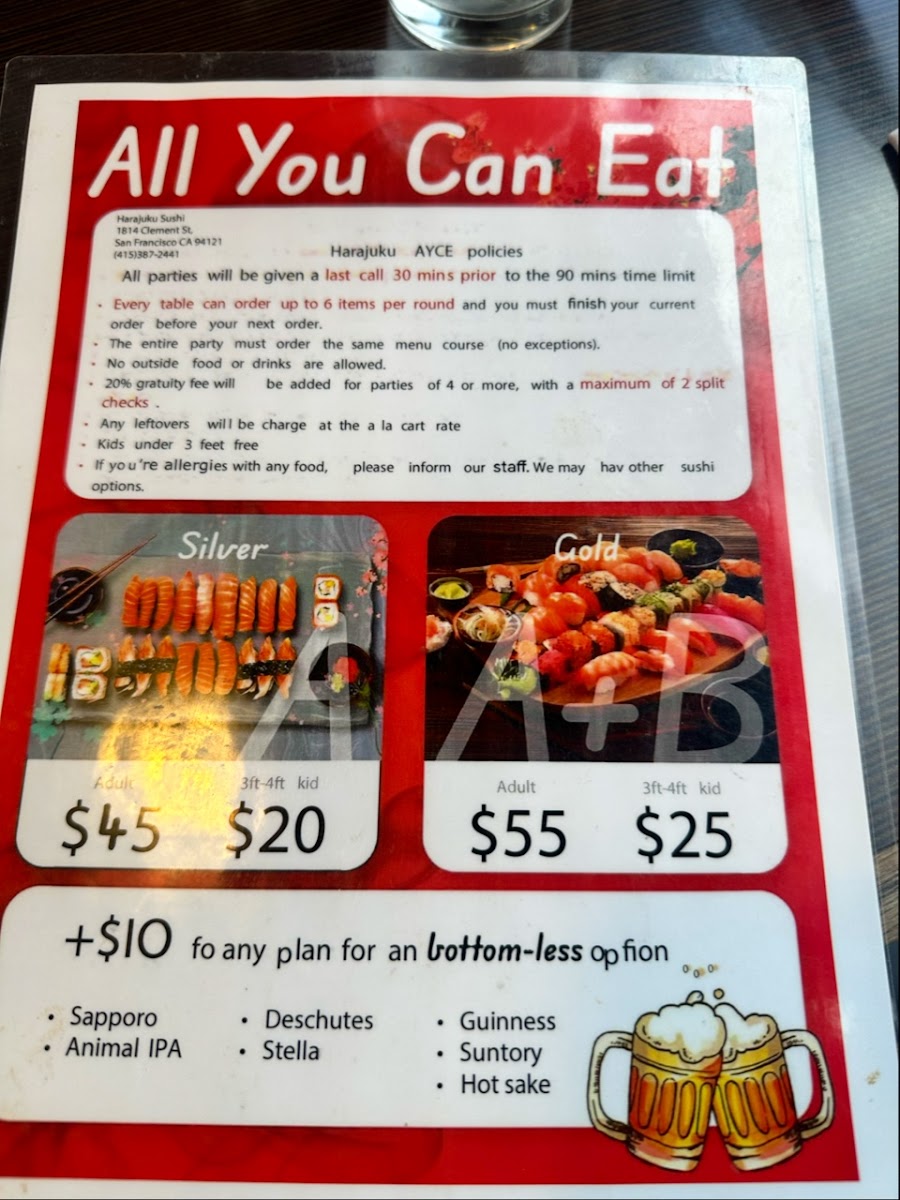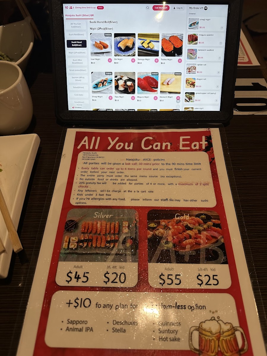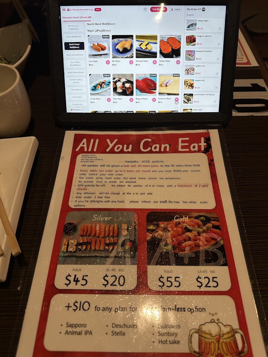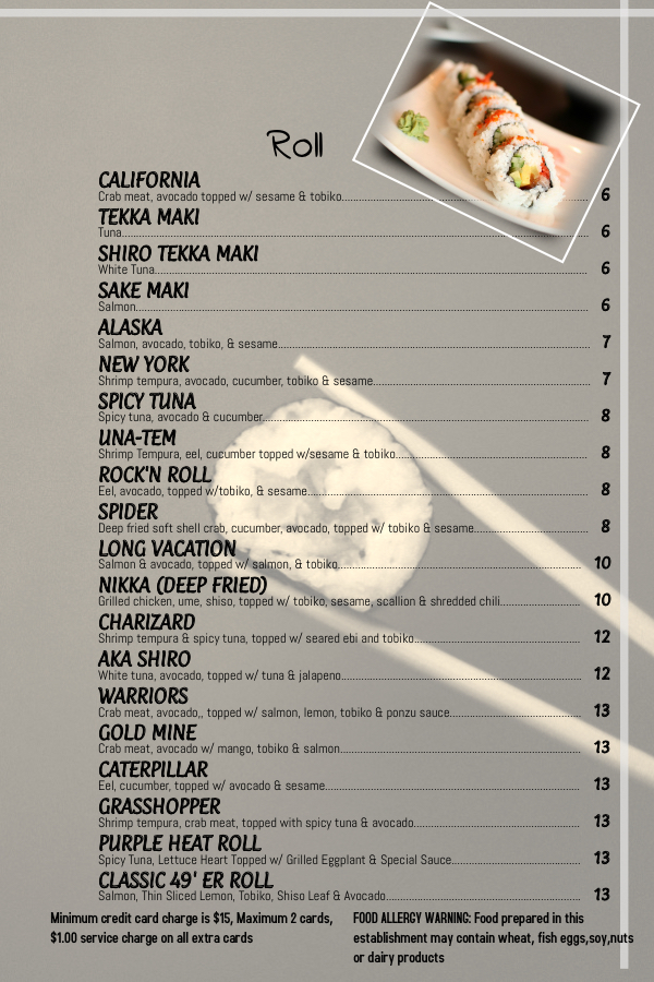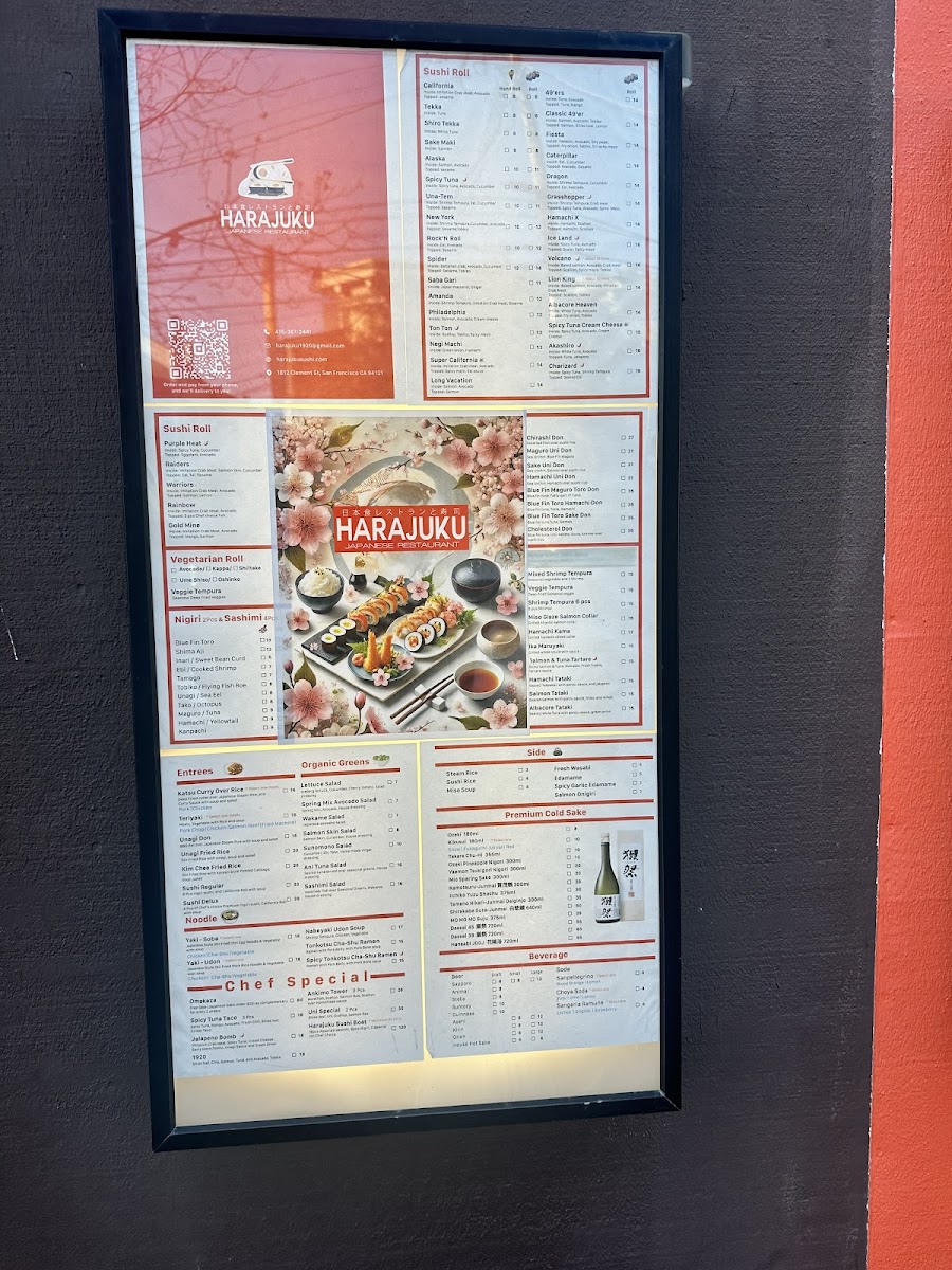 Harajuku Sushi offers a diverse and flavorful menu, perfect for those seeking a mix of traditional Japanese dishes and creative sushi options. For appetizers, diners can enjoy items like the Jalapeno Bomb (K-71) and Fish Tempura (K-72), alongside Pork Gyoza 5 PCS (K-1) and Vegetable Gyoza (K-2). The sushi rolls section features classic options like the California Roll, Tekka Maki, and Sake Maki, with the more adventurous Alaska Roll for those seeking something different. The Sushi Nigiri options are varied, including Maguro Nigiri and Hamachi Nigiri, each served in pairs, while the sashimi selection includes delicacies like Blue Fin Toro Sashimi (4PCS) and Bluefin Maguro Sashimi (4PCS). For a heartier meal, their Sushi Rice Bowls offer a filling choice, with options such as Sake Saba Don and Maguro and Shiro Maguro Don. Entrees like Unagi Fried Rice (K-14) and Kimchi Fried Rice (K-15) provide satisfying sides, while the Beef Rib-eye Teriyaki (K-16) and Chicken Teriyaki (K-17) offer flavorful grilled meat dishes. Overall, Harajuku Sushi presents a varied menu with something for everyone, whether you're in the mood for sushi, sashimi, or a hearty entrée.