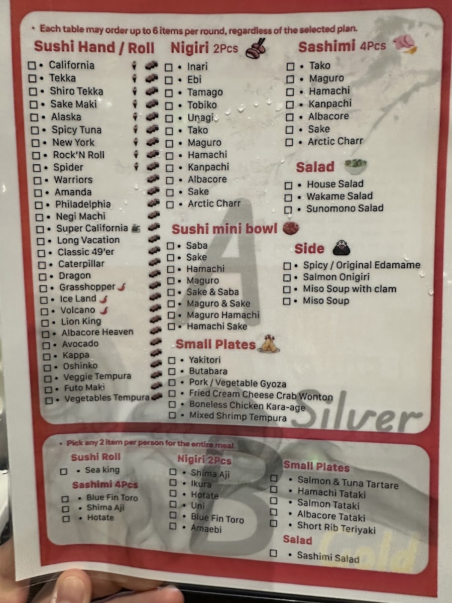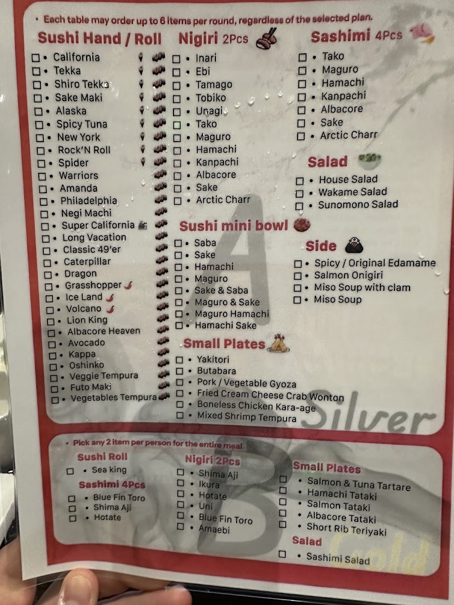 Crab meat, salmon skin, cucumber topped with crab meat, eel, avocado, sesame, and tobiko.